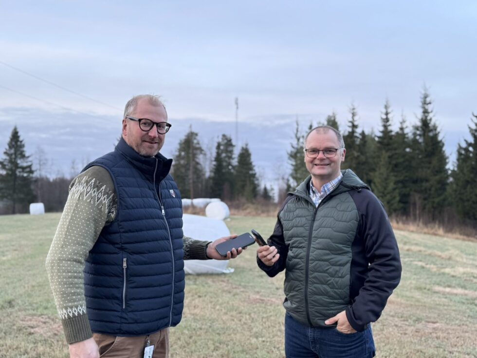 BEDRE SIGNAL: Nå blir det bedre signal på Grue vestside og på Grue Finnskog. Næringsrådgiver i Grue kommune Haakon Gjems (til venstre), og prosjektleder i Telenor Pål Lukashaugen, forteller at dette vil være et betydelig løft for områdene rundt mobilmastene. Her med masta i Skavåsen på Grue vestside i bakgrunn.