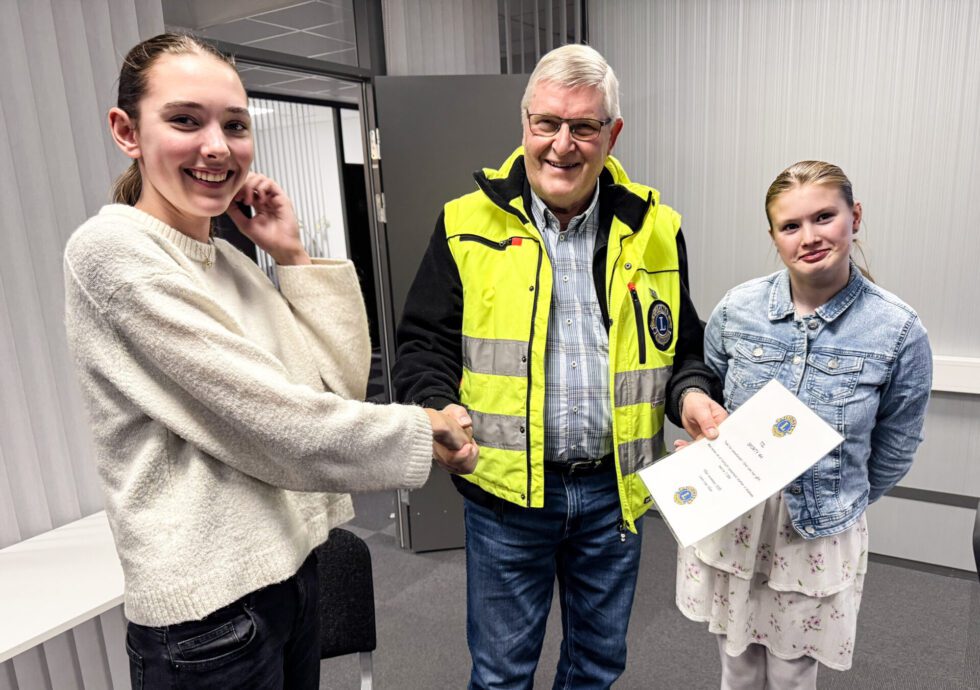 GAVEOVERREKKELSE: Steinar Sandnæs fra Lions Våler overrekker en fortjent påskjønnelse til Sporty 4H. Her flankert av sekretær Kristina og kasserer Liv Jorunn fra klubben.