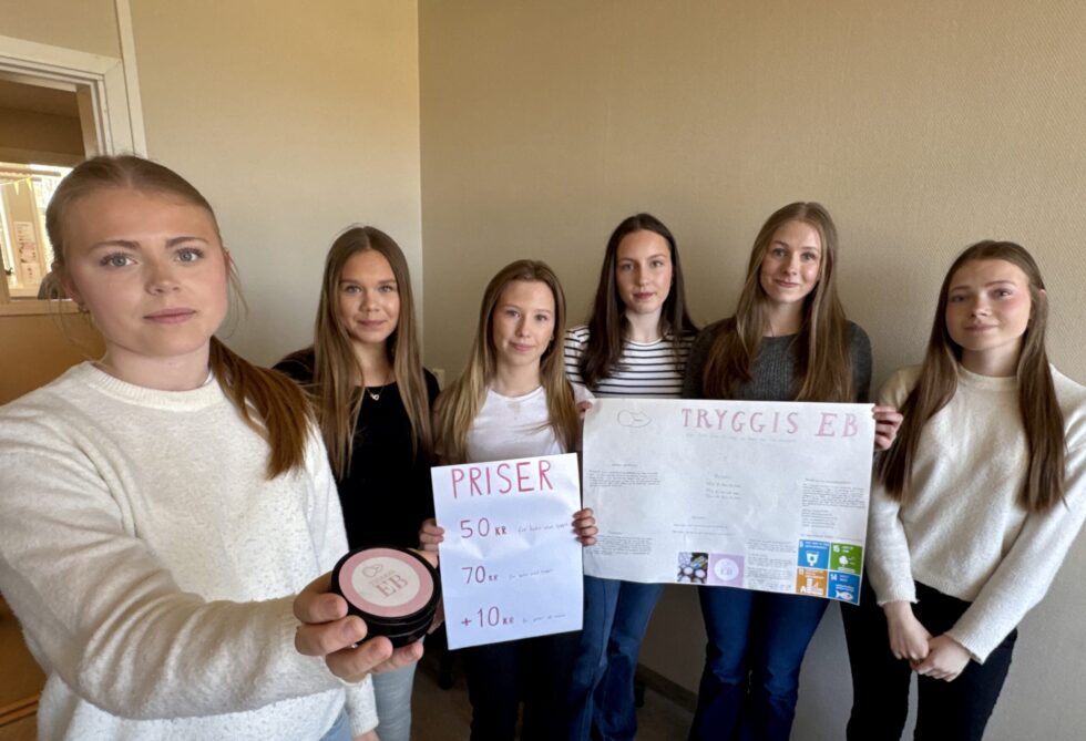 FOR BRUKT TYGGEGUMMI: Denne gruppa tenker på miljøet og har laget oppbevaringsboks for brukt tyggegummi. Fra venstre Astrid Breisjøberget, Tindra Hals Korsmo, Wilma Viktoria Antonsen Wallander, Hedda Kristiansen, Barbro Vanebo og Mina Breisjøberget.