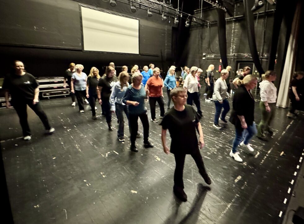 MANGE: Her er det Angelica Norheim som står foran og instruerer, og Liv Karin Bergsløkken er nærmest i første rekke. Som vi ser var det nesten trangt om plassen på scena.